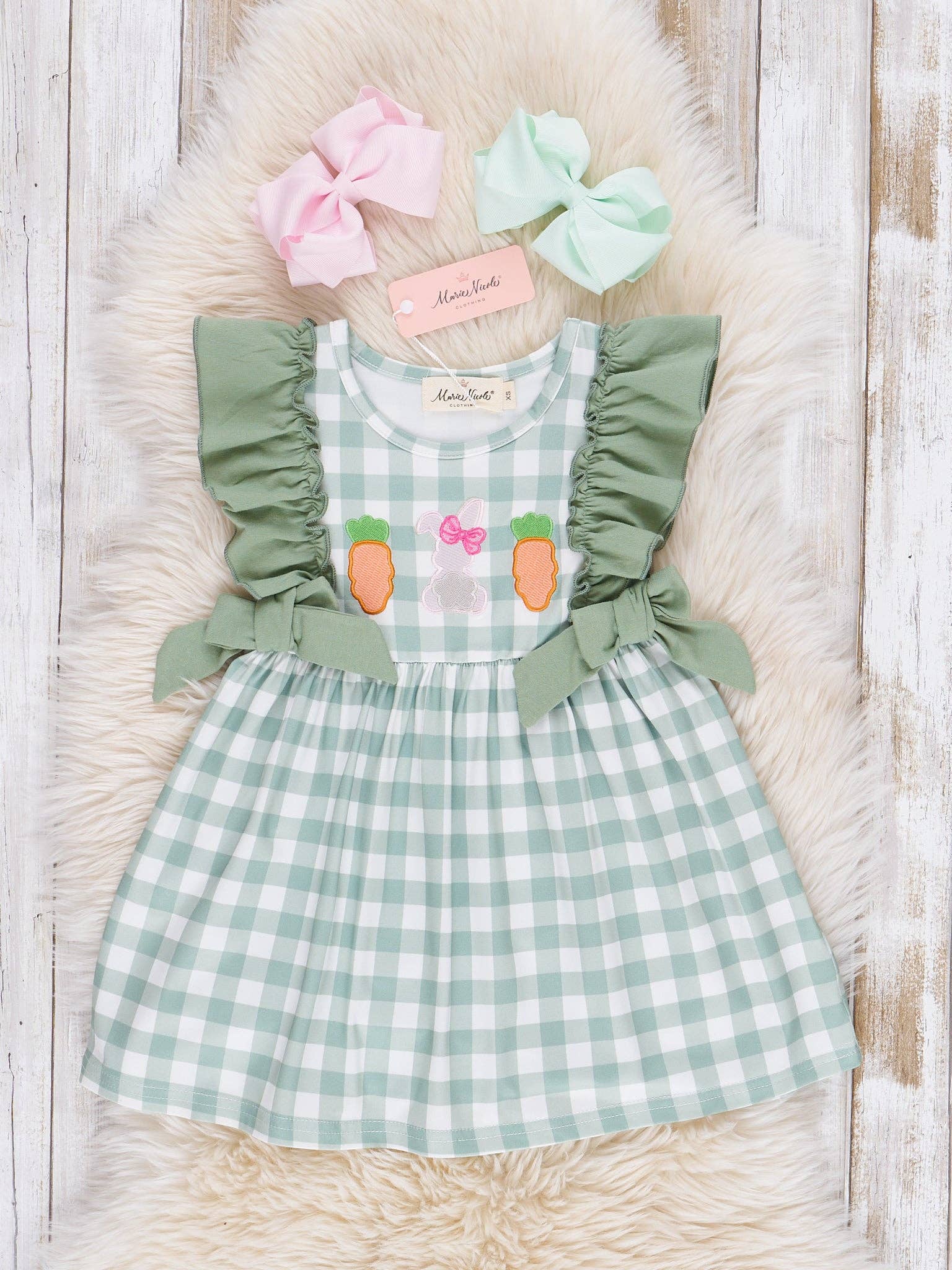 Get ready for Easter with our Gingham Carrot Patch Embroidered Dress by Marie Nicole Clothing! This playful girls dress features an adorable embroidered carrots and bunny design, perfect for the holiday. The green ruffles & bows detail adds a touch of charm, while the gingham print screams spring. * Fits true to size. * 95% Polyester / 5% Spandex * Combo: 97% Cotton / 3% Spandex *